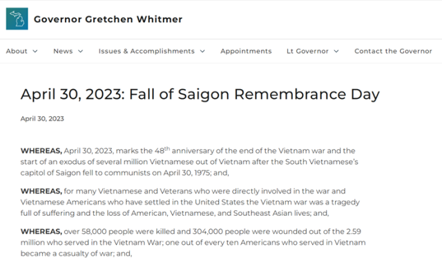 Bà Gretchen Whitmer, Thống đốc tiểu bang Michigan, vừa đưa ra tuyên bố nhân dịp 48 năm ngày kết thúc Chiến tranh Việt Nam, 30 tháng 4, gọi đó là “Tháng 4 Đen”, trong nỗ lực nâng cao nhận thức của cộng đồng về sự kiện quan trọng này, nhất là cho thế hệ trẻ.