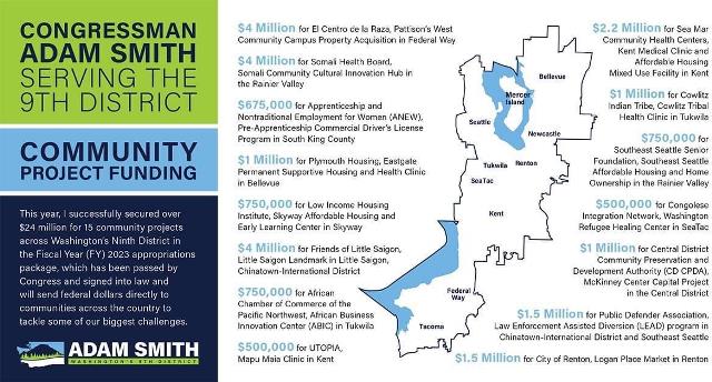 Tin từ văn phòng Dân biểu liên bang Adam Smith cho biết vào ngày 23/12 năm ngoái, Tổng thống Joe Biden đã ký ban hành ngân sách cho tài khóa 2023, trong đó bao gồm ngân khoản $24 triệu đô la tài trợ cho 15 dự án cộng đồng trong khu vực do vị dân biểu này đại diện; và đặc biệt trong số này có 4 triệu đô la dành riêng cho Friend of Little Saigon, tổ chức bất vụ lợi quản lý khu phố Việt Little Saigon tại thành phố Seattle.