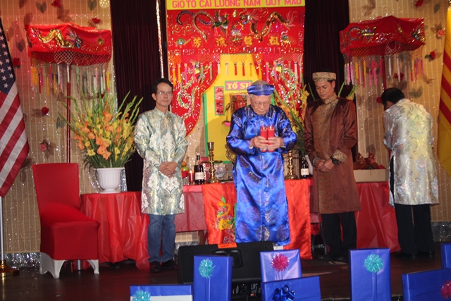 Trong bầu không khí trang nghiêm, khói hương bay quyện, Nhạc sĩ Võ Hà Khuê cùng các anh chị em nghệ sĩ của Ban Cổ Nhạc Seattle, lần lượt lên bàn thờ dâng hương lạy Tổ, theo thứ tự vai vế trong đoàn và thứ tự theo tuổi tác, kính lão đắc thọ.