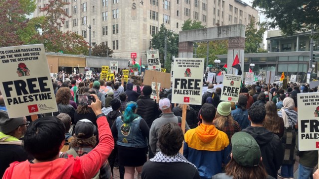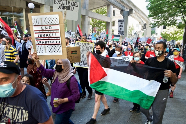 Người biểu tình đã tràn ngập công viên Westlake trong khu downtown Seattle vào thứ hôm Bảy 14/0, để phản đối tình trạng bạo lực leo thang tiếp theo sau các cuộc tấn công bất ngờ của lực lượng Hamas vào lãnh thổ Israel vào tuần trước.