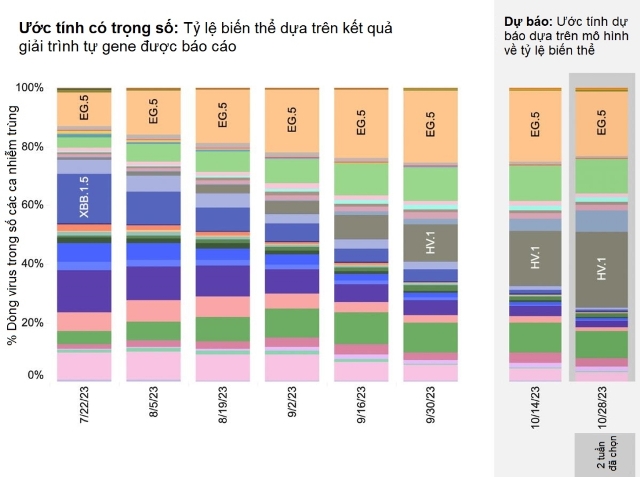 HV.1 đã tăng từ 1.1% vào đầu tháng Tám lên 25.2% số trường hợp nhiễm COVID. Trong khi đó, EG.5 đã giảm từ 24.3% vào ngày 30/09 xuống mức hiện tại là 21.9% trong vòng một tháng.