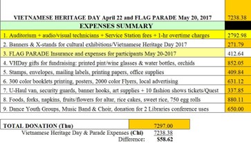 Excell spreadsheet trên computer giúp mình cộng trừ/calculate tự động, rất chính xác. Các Receipts duoc lưu trữ 7 năm, sẵn sàng cho Sở Thuế IRS giám sát mình là một đoàn thể 501(c) có nhận Grant, có budget chi tiêu rõ ràng. Trước April 15 hàng năm, dù HCN không đóng thuế đồng nào (vì chi tiêu dưới $50,000), vẫn phải e-file khai thuế ngắn gọn mẫu Form 990-N cụt ngủn như cái carte.