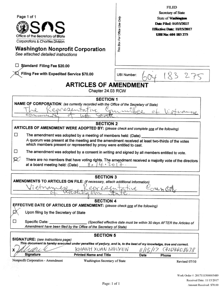 1. Xin kính trình cùng quý đồng hương là vào ngày 15 tháng 11, năm 2017 chỉ vài tháng sau khi họp VỚI ĐẠI HỘI ĐỒNG HƯƠNG THÁNG 3, 2017, MỘT MÌNH ông Nguyễn Xuân Khanh tự ý đã đổi tên CỘNG ĐỒNG 6 NĂM QUÊN TRẢ TIỀN QUÊN KHAI THUẾ từ THE REPRESENTATIVE COMMITTEE OF VIETNAMESE COMMUNITY OF WA STATE qua VIETNAMESE REPRESENTATIVE OF WASHINGTON STATE BỞI MỘT MÌNH ÔNG TA THÔI.