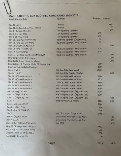 Có gì lạ không quý vị? Trong bản danh sách thu của buổi tiệc cộng đồng 27/08/2023 do chính Giáp Phúc Đạt giao cho ông Nguyễn Văn Bảo chỉ có 1 gia đình Phật Tử Vạn Hạnh tặng góp $300 trong cột Tiền Mặt, ngoài ra không còn ai khác tặng góp khoản nào $300 nữa, nhất là bằng check.