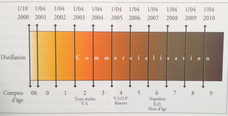 Theo luật mới, để được mang nhãn XO, bắt đầu từ năm 2016, rượu trẻ nhất phải trên 10 năm rưỡi (trộn với các rượu 20, 30, 40, 50 năm) Đúng ra, tính từ lúc chưng cất phải cộng thêm một năm (xem hình) vì Bureau de cognac qui định bỏ năm đầu coi như compte 0 thay vì tính một năm, lẽ ra VS, phải được tính ít nhất ba năm rưỡi thay vì hai năm rưỡi.