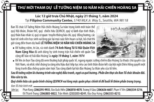 Home Tin Cộng Đồng THƯ MỜI THAM DỰ 50 NĂM HẢI CHIẾN HOÀNG SA Tin Cộng Đồng THƯ MỜI THAM DỰ 50 NĂM HẢI CHIẾN HOÀNG SA By vietseattle - January 13, 2024 Modified date: January 15, 2024 18 0