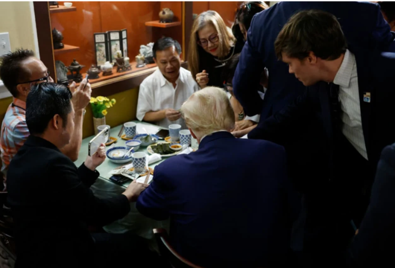 “Làm cho nước Mỹ vĩ đại trở lại!” một thực khách hô lên bằng tiếng Anh với giọng Việt đặc trưng, khiến ông Trump bật cười.
