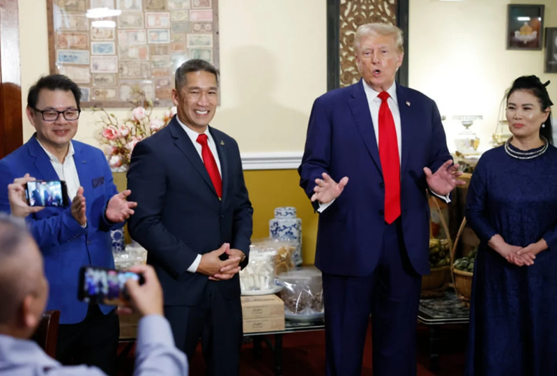 “Làm cho nước Mỹ vĩ đại trở lại!” một thực khách hô lên bằng tiếng Anh với giọng Việt đặc trưng, khiến ông Trump bật cười.